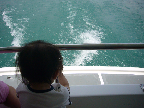 飛寶寶即將一歲,實在是出遊的好時節,第一次的搭船就獻給了日月潭。本來我堅持想花個兩百元一小時租手划小船,自己在湖上面慢慢划,可是賣票的人為難的看著我們兩個大人一個嬰兒再加一隻狗,他說實在不能租給我,除非我把狗留在陸上。於是就在我們考慮的時候,在賣票的跟旁邊一堆船長嚷嚷聲中,我娘才說還是搭船好了,就有一個船長直接跟我們說那跟我來,賣票的也就搖手說不用買票,錢直接給那個船長。接下來我們就在催促中跟著那個船長上船了。本來說馬上就要開船,一等又是二十幾分鐘。船上還有更早上來的遊客都已經很不耐煩,幸好他是算比較大的遊艇,才沒有暈船的感覺。