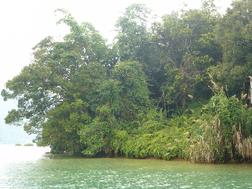 到了對岸,都是烤山豬那些吃的東西,還有就是一般的名產店什麼的。逛一逛逛到一家鞋店還不錯,結果還在考慮要不要買鞋,赫然發現已經快到了開船的時間。我們趕快別了店家,店家還在一直念:別急,船會等啦!我娘在後面推嬰兒車,叫我跟狗先跑,到了岸邊,發現船開走了。我們才發現一個可怕的事實!就是雖然有統一售票點,但是日月潭的船家其實是分開來的。意思就是除了那個來的船,其他的船你通通不能搭!接下來就有其他船長開始問啦~你搭哪一艘啊!聽了我搭的船名「忠信3號」,每個船長的反應都很糟,有一個跟我說,算你倒楣啦!他都不等的。雖說是我們沒準時到,聽到這種情況還是很氣,而且開船時也沒準時開,卻因為接下來時間客人比較多,他就趕著開回程好再走下一攤客人。更妙的是旁邊有船長好心幫我打電話給他,結果那艘船的船長跟我說:那你就等下一次我過去再帶你回來。我問他大概什麼時候,他又說不知道,叫我慢慢等......整個傻眼的情況下。旁邊的船長才跟我說原來日月潭的國家管理處後來規定他們不可以統一營運,所以才會造成現在這樣的狀況,大家自己走自己的。不過話說回來他們卻又沒跟買票的人先講原來我們可以選船選船長。「懷恩1號」的船長是很好心的跟我說等等搭他的船回去就好了,後來提早突然旁邊有一家諾亞方舟公司的船長,叫我們現在就可以跟另一個「美和5號」的船長走。那是一艘小型遊艇,上了船才知道他是有一對夫妻包下的船,「美和5號」的船長去問那對夫妻,他們同意讓我們一起搭的。(所以是好心人讓我們當電燈泡的意思)