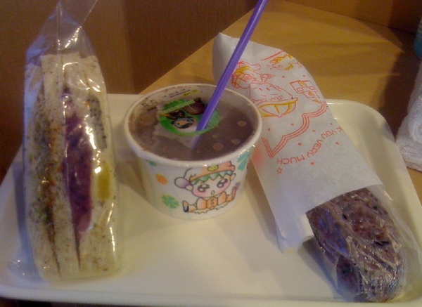 妙的是一路茹素,雖然清粥小菜店連顆鹹蛋都沒有。但是後來我們喝酒的那家店有肉是不特別,最特別的是拜拜台子外面的園遊會攤販正在賣炸熱狗!這讓第二天看到早餐的我想吶喊~~~既然正在拜神明的外面都可以生炒花枝和炸熱狗,那我不要吃素早餐啦!(而且為什麼素三明治裡要包火龍果跟鳳梨?)